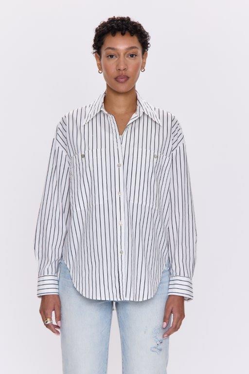 The Pistola Samantha in Noir Le Blanc is an oversized button-up shirt with bold black stripes on crisp white fabric. It features a relaxed, boyfriend fit with front flap pockets, a classic collar, and cuffed long sleeves—perfect for effortless, modern styling.
