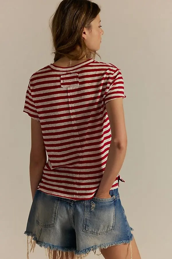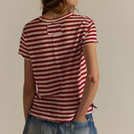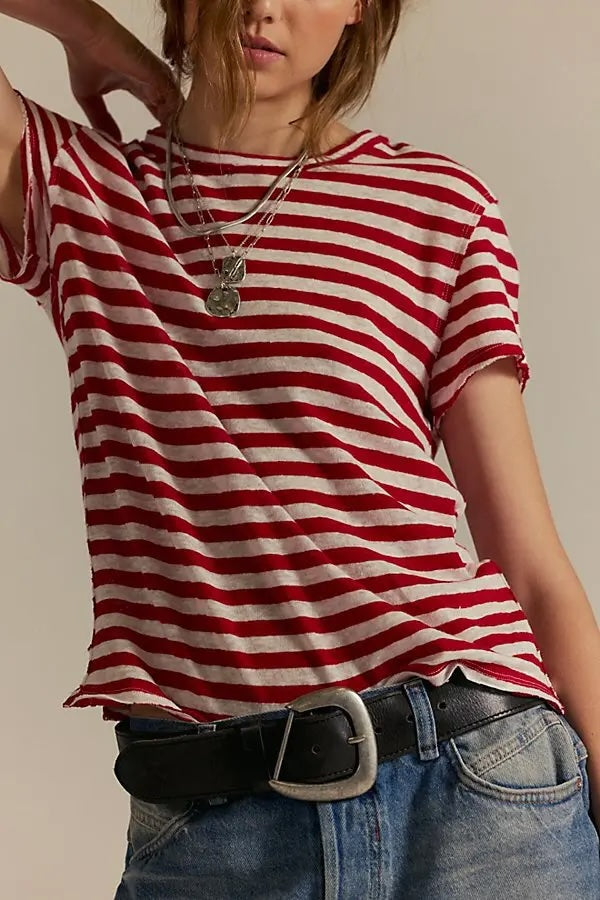 The Nora Tee is a laid-back essential with a timeless stripe pattern. Crafted in a soft, breathable cotton blend, it features a classic crew neckline, short sleeves, and a relaxed fit that makes it an easy go-to for everyday wear. The red-and-cream stripe combo brings a touch of vintage-inspired charm, while the slightly longer length makes it perfect for tucking, knotting, or wearing loose.