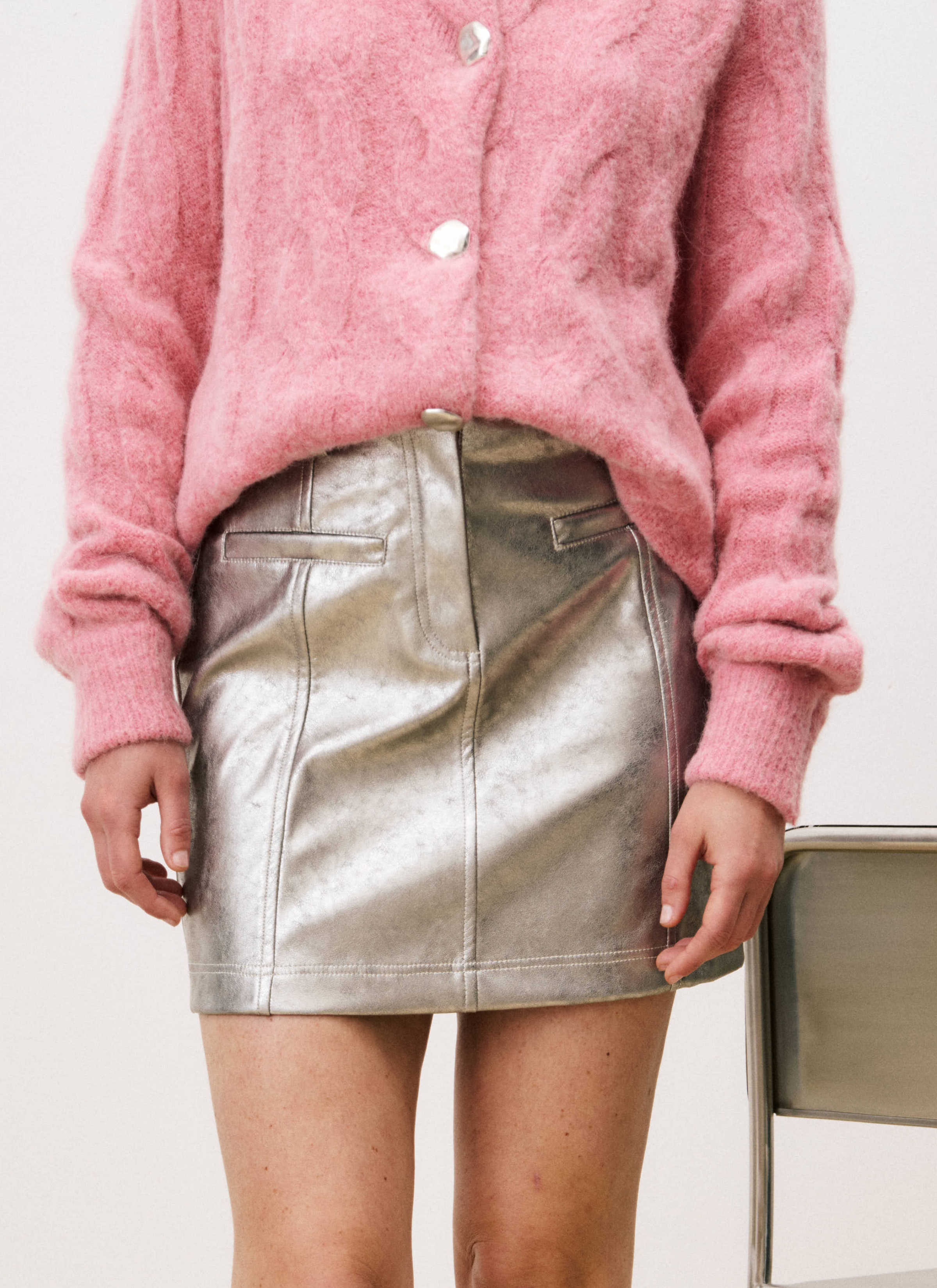 Shiny, chic, and ready to party, this silver pleather mini skirt is your ultimate holiday statement piece—just add a cozy knit or a sleek top.