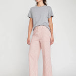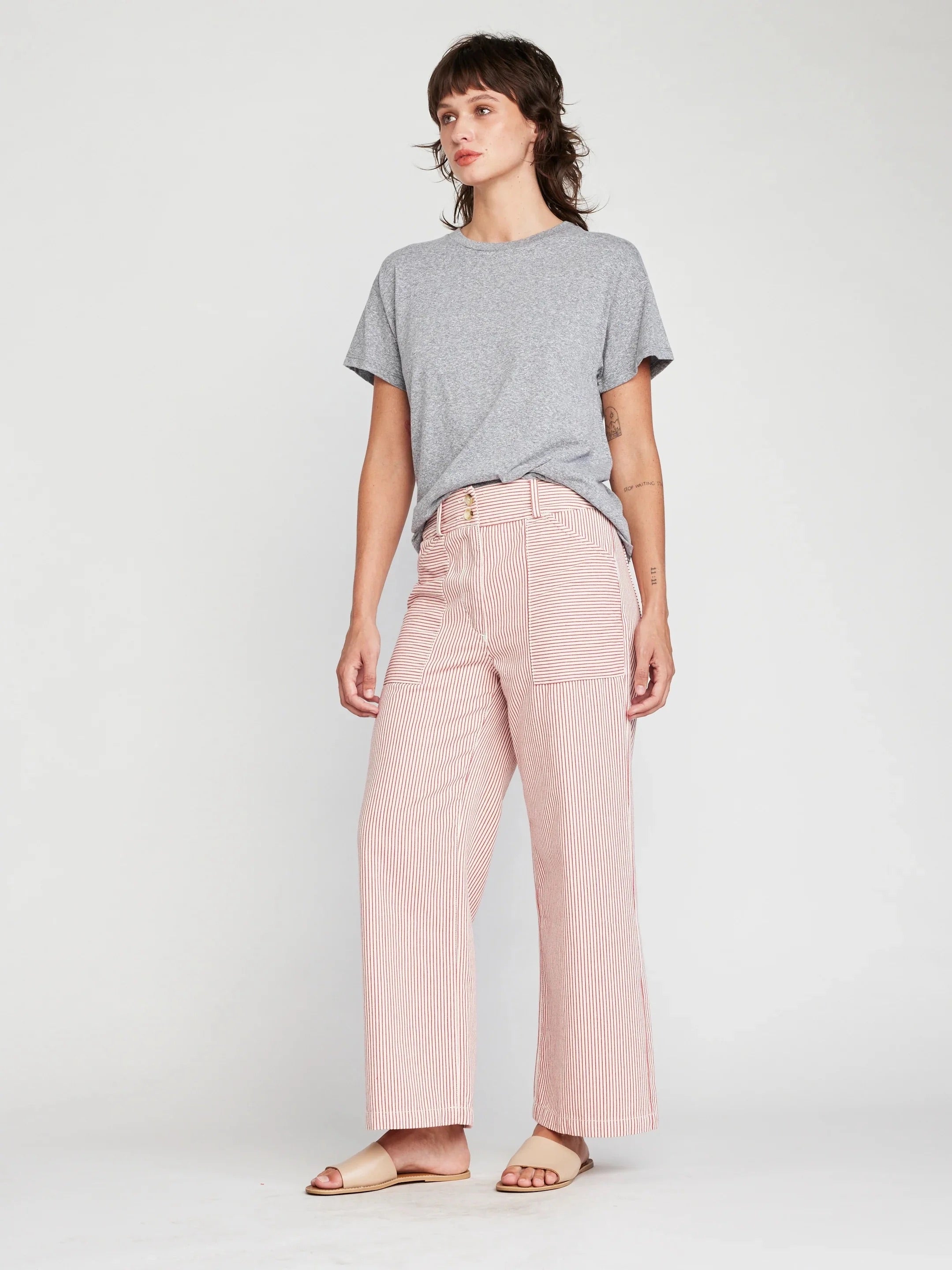 A staple in your closet. The Aria is a dreamy high waisted pant. Garment dyed to perfection in red and white stripes for Spring. You will love the dual button closure, slant pocket detail and a flare that will make em stare! Fabric Content: 53% Cotton, 44% Tencel, 3% Spandex