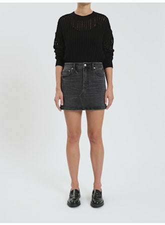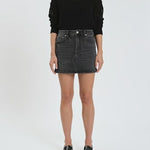 This is the “Malibu Mini” skirt, a high-rise denim mini with a faded black wash for a perfectly lived-in look. It features a classic five-pocket design, front zipper and button closure, and subtle distressing for a touch of edge. The straight, slightly A-line fit creates a flattering silhouette that pairs effortlessly with tucked-in knits, graphic tees, or cropped tops for a chic, off-duty vibe.