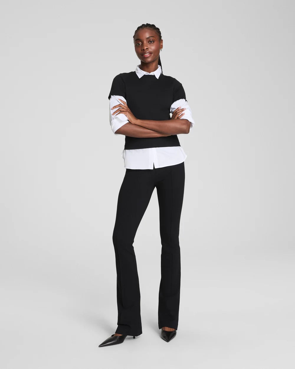 This smoothing pant comes in our premium ponte fabric and offers built-in and targeted core-shaping technology, powered by SPANX CoreSure Tech™. With comfortable 4-way stretch compression, these curve-hugging micro flares provide the PerfectFit, every time. All you have to do is simply pull them on. No zippers, no buttons, and no pockets (so no bulk!) at the hips—all for the ultimate, smoothing effect.