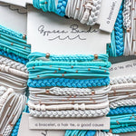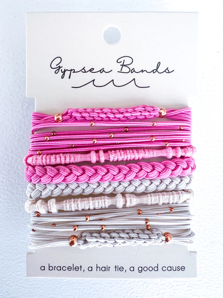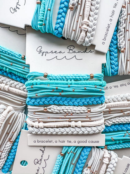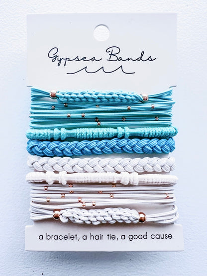 Set of 10 bands Multi functional as a bracelet and hair tie Holds hair securely without snagging Helps save the ocean and coastlines