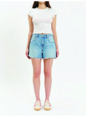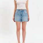 Mid-rise denim shorts in a light-wash finish with a relaxed, everyday fit. Designed with classic five-pocket styling and raw, frayed hems for a casual, lived-in look. Easy and versatile, these shorts pair perfectly with tees, tanks, or lightweight knits for warm-weather wear.