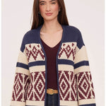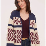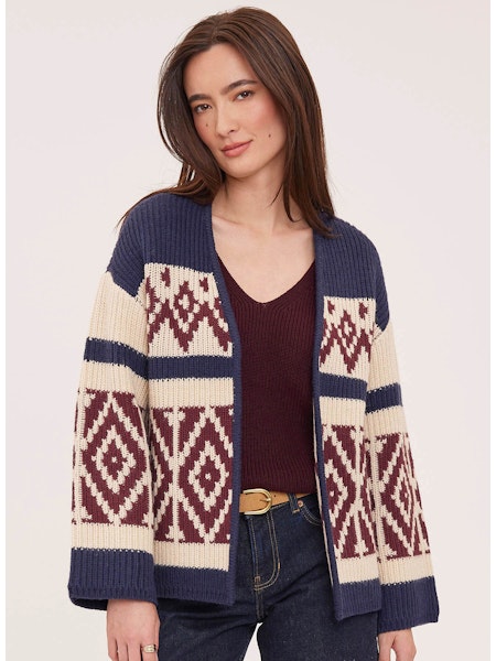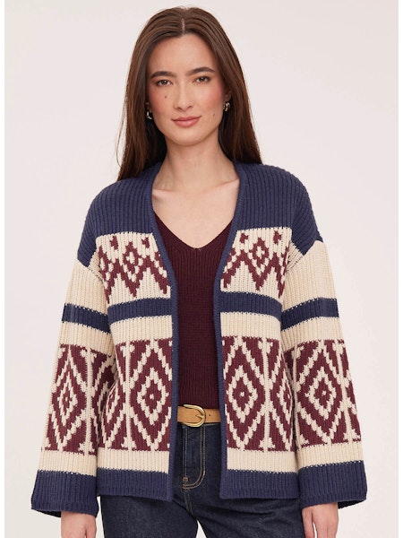 A cozy statement layer with timeless appeal. Featuring a navy base with cream and burgundy geometric detailing, this open-front knit has a relaxed fit and ribbed trim for an easy, flattering drape.
