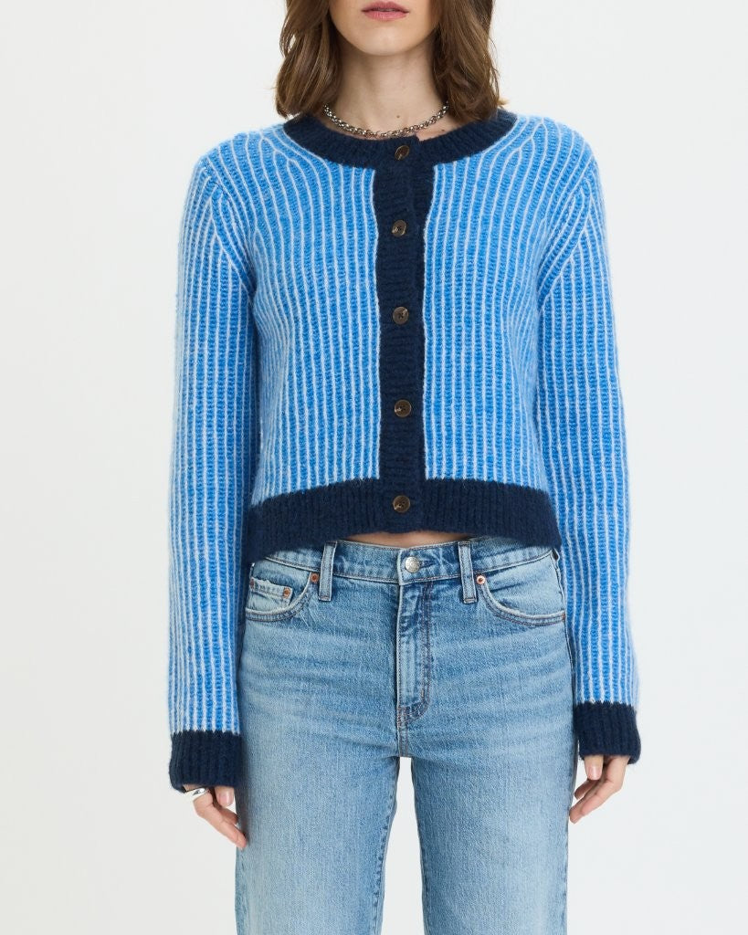 A cropped knit cardigan in a bright blue with navy contrast trim and button-front closure. Cozy with a modern edge, ideal for layering over tees or tanks.
