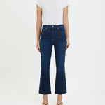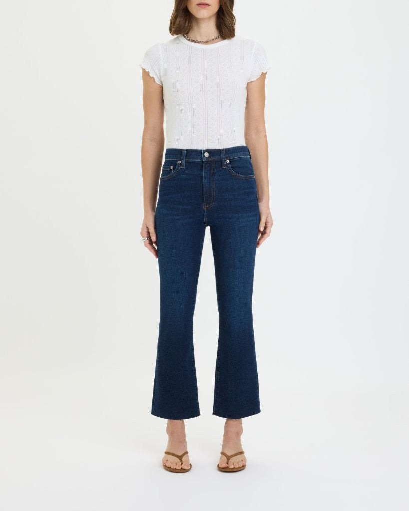High-rise cropped flare jeans with a slim fit through the hip and subtle kick flare. A fresh, flattering silhouette that pairs perfectly with fitted tops.