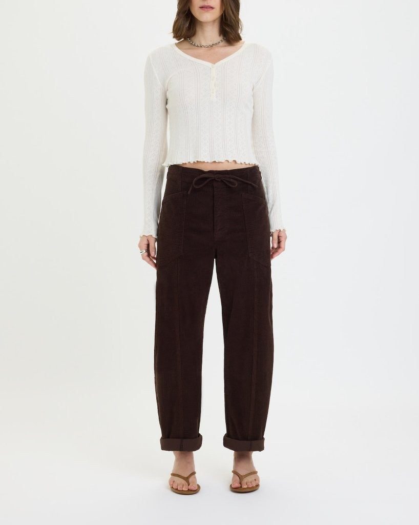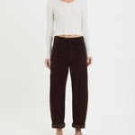 Relaxed brown pants with a soft, lightweight feel and adjustable drawstring waist. Easy, laid-back fit with cuffed hems—ideal for casual days or elevated lounging.