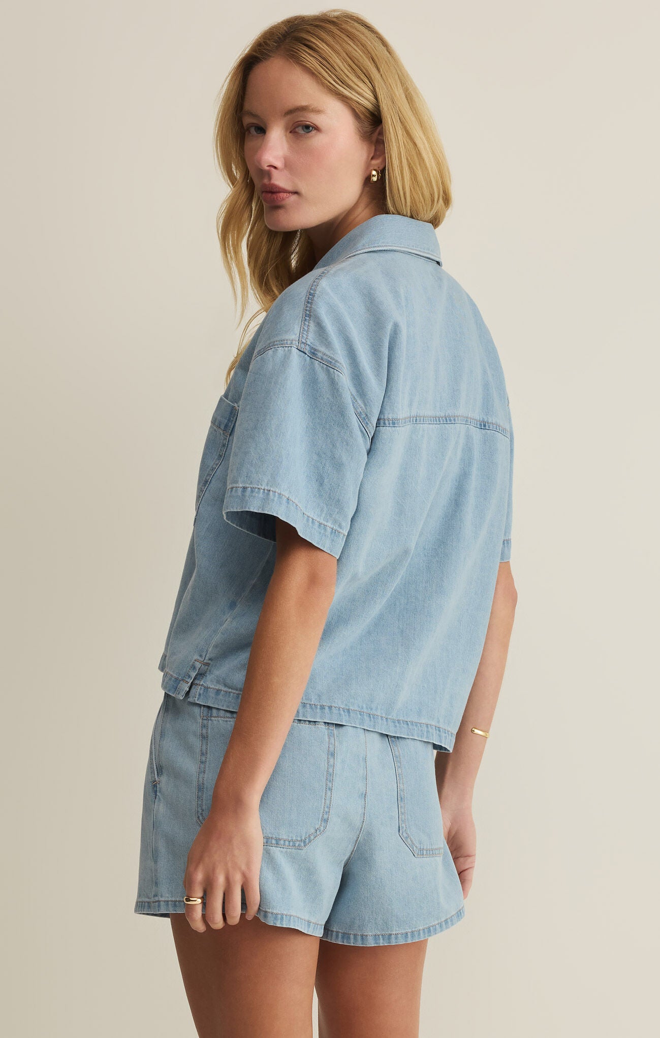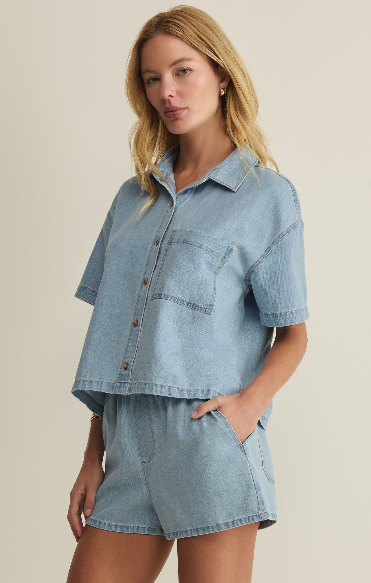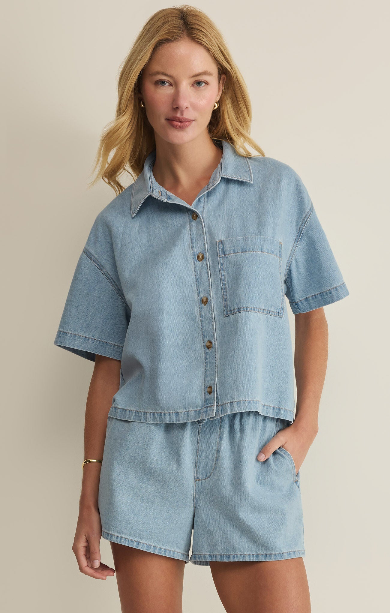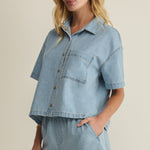 Casual, cool, and effortlessly polished — this Z Supply denim button-down is the perfect warm-weather staple. With its relaxed, boxy fit, soft lightweight denim, and easy short sleeves, it pairs with anything from shorts to white denim. Wear it buttoned up or open as a laid-back layer for that timeless, lived-in look.