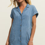 This is the “Napa Mini Denim Dress”, a short-sleeve button-front shirt dress made from lightweight, washed denim for an easy, relaxed fit. It features a notched collar, rolled sleeves, and rounded front patch pockets, giving it a laid-back yet polished look. The mini length and softly structured silhouette make it perfect for warm-weather days—wear it with sneakers or sandals for effortless, casual chic style.