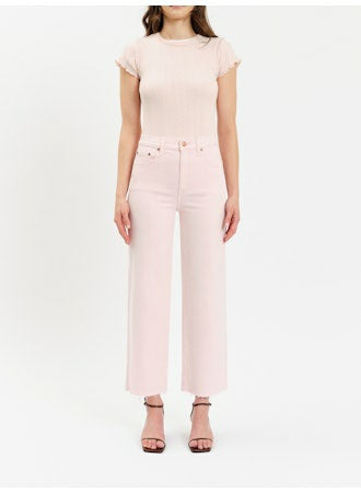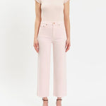 These are the “Please High Rise” jeans, designed with a flattering high waist and a modern wide-leg silhouette. Made from soft, premium denim in a light blush pink wash, they feature a cropped length and a clean hem for a polished yet playful look. The structured fit through the waist and hips gives way to a breezy, relaxed leg—perfect for pairing with fitted tops or tucked blouses for an effortlessly chic, feminine style.