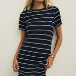 This is the “Franka Mini Dress”, a ribbed knit short-sleeve dress featuring horizontal white stripes on a navy base. It has a slim, body-skimming silhouette with subtle lettuce-edge trim at the hem and sleeves, adding a feminine touch. The stretchy, textured fabric offers comfort and structure, making it easy to dress up with sandals or down with sneakers for a chic, effortless look.