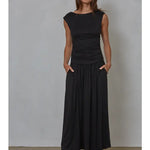 • Design: Sleeveless midi dress with a wide boat neckline and gathered ruching at the waist for a flattering, feminine shape.