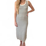 This dress is a sleeveless, striped midi dress with a fitted yet comfortable silhouette. It features a scoop neckline and falls below the knee, giving it a versatile, casual-chic look. The horizontal stripes add a modern touch, making it easy to wear on its own in warmer weather or layered with a jacket or sweater for transitional seasons.