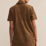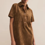 All the polish of a shirt dress, now in ultra-soft faux suede. Fully lined with patch pockets and metal shank buttons, this mini is perfect for transitional days when you want style and ease. Featuring a collared neckline with a snap front closure, short sleeves, and two breast pockets.
