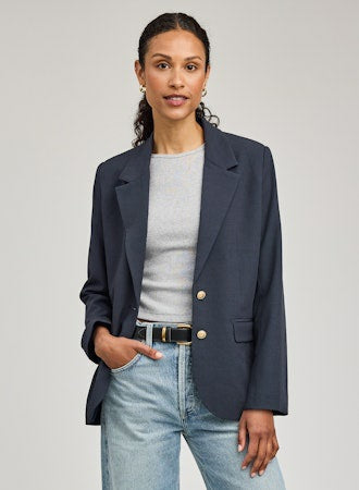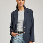 This is the “Margot Blazer”, a classic tailored jacket in a navy blue hue. It features structured shoulders, a notched lapel, and two gold-tone buttons for a refined, timeless look. The blazer has a slightly relaxed fit, front flap pockets, and a mid-length cut that makes it easy to style with jeans, trousers, or over a dress. Perfect for both polished office wear and elevated casual outfits.