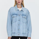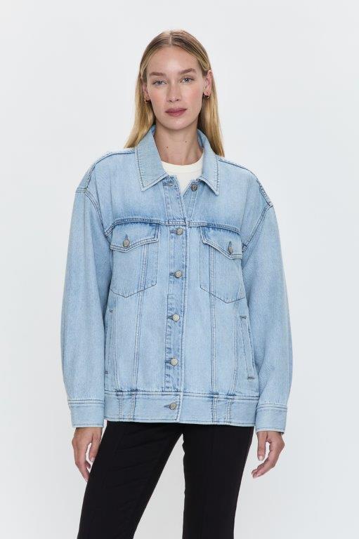 The Pistola Rowan is an oversized denim jacket with a relaxed, boyfriend fit. It features a soft, drapey feel thanks to its Tencel-blend fabric, classic trucker-style details like flap chest pockets and metal buttons, and a light vintage wash that gives it a lived-in, effortless look. Perfect for layering over everything from dresses to tees.