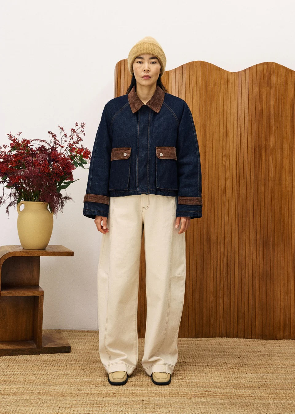 A modern take on a timeless classic, the Zola Jacket blends rugged denim with refined corduroy details. Featuring a rich indigo wash, contrast topstitching, and oversized patch pockets with button flaps, it’s equal parts functional and stylish. The corduroy collar and pocket trims add warmth and texture, giving it a vintage-inspired edge. Perfect for layering through the seasons, this versatile jacket elevates casual looks with effortless French cool.