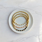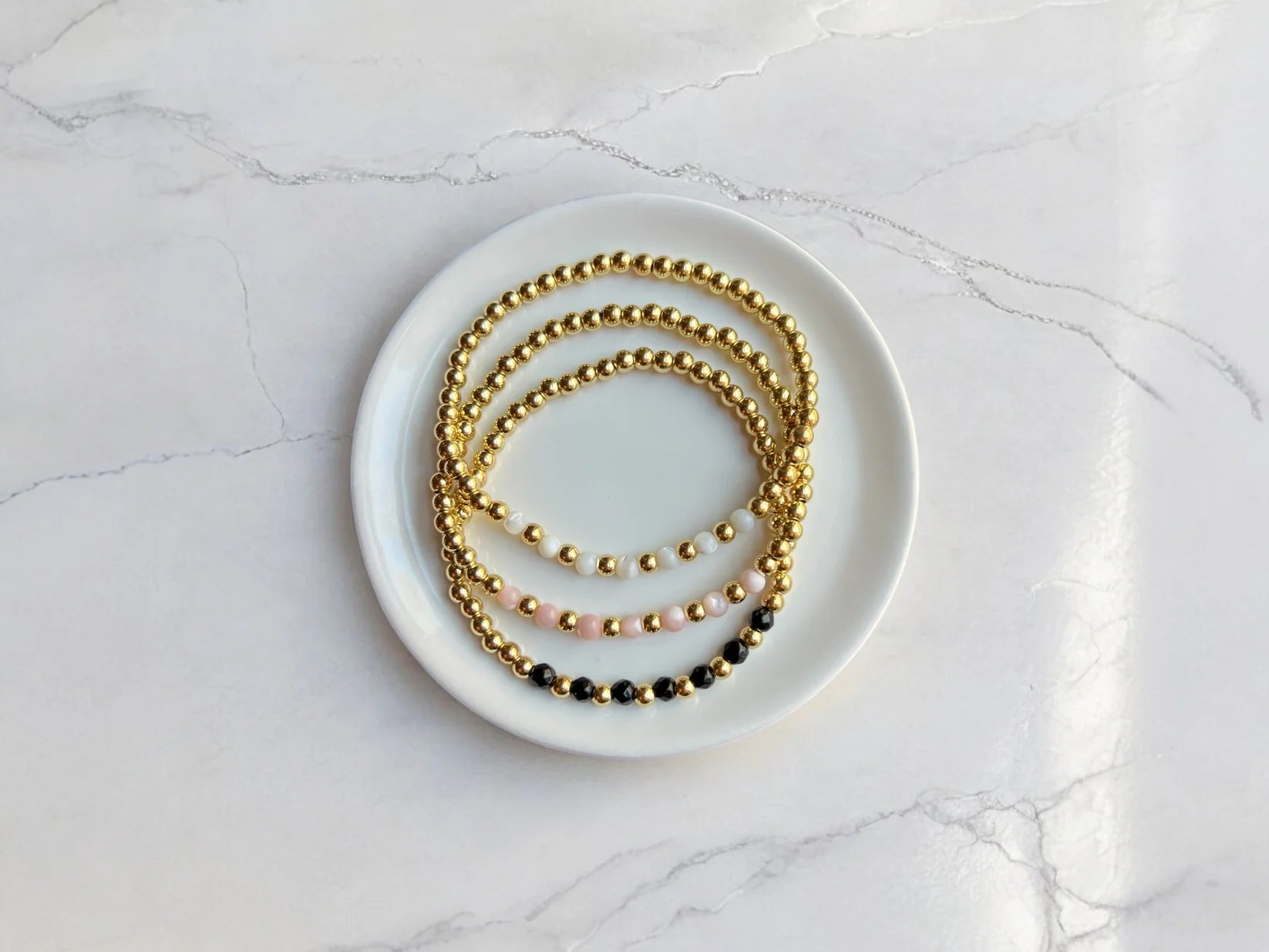 Lottie Lew stretch bracelets are dainty, lightweight, and perfect for everyday wear. They feature polished gold beads with subtle accents in pink, white, or black. Each bracelet is easy to slip on and designed for effortless stacking. A simple, chic accessory that elevates any outfit.