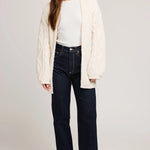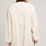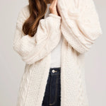 The Betty cardigan is made of a fuzzy yarn with a lofty feel. Features include various cable knit stitch patterns and a rolled sleeve hem detail.