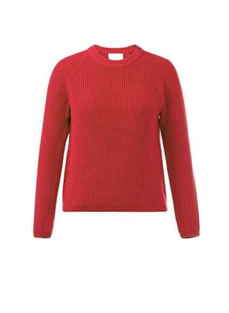 A classic red knit pullover with a simple crew neckline and long sleeves. The sweater features a ribbed texture throughout, a relaxed yet polished silhouette, and a timeless design that works well for layering or wearing on its own. Cozy, versatile, and easy to dress up or down for everyday wear.