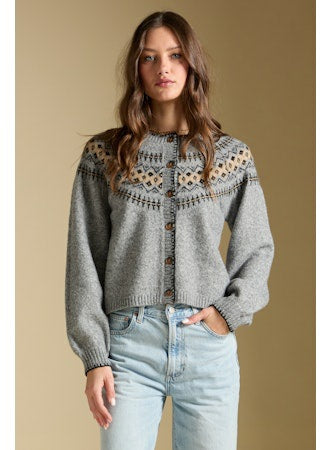 A soft gray cardigan with intricate patterned detailing across the yoke and button-front closure. Slightly cropped with a relaxed silhouette, offering a vintage-inspired look that pairs easily with denim.