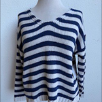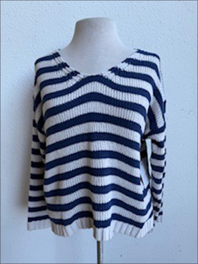 Woven Heart Navy Stripe Sweater – Cozy and casual, this soft knit features bold navy and cream horizontal stripes for a timeless nautical-inspired look. Designed with a relaxed fit, dropped shoulders, and a wide V-neckline, it’s perfect for layering over a tank or pairing with your favorite denim. Ribbed trim at the cuffs and hem adds structure, while side slits offer comfort and easy movement.