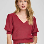 This is the “Phoebe Sweater” in red, a lightweight knit top featuring a feminine V-neckline and short puff sleeves with ribbed cuffs. The fabric has a soft texture with subtle stretch, offering a flattering, fitted silhouette that hits at the waist. Its classic yet playful design makes it perfect for pairing with denim or skirts — ideal for both casual days and polished outings.