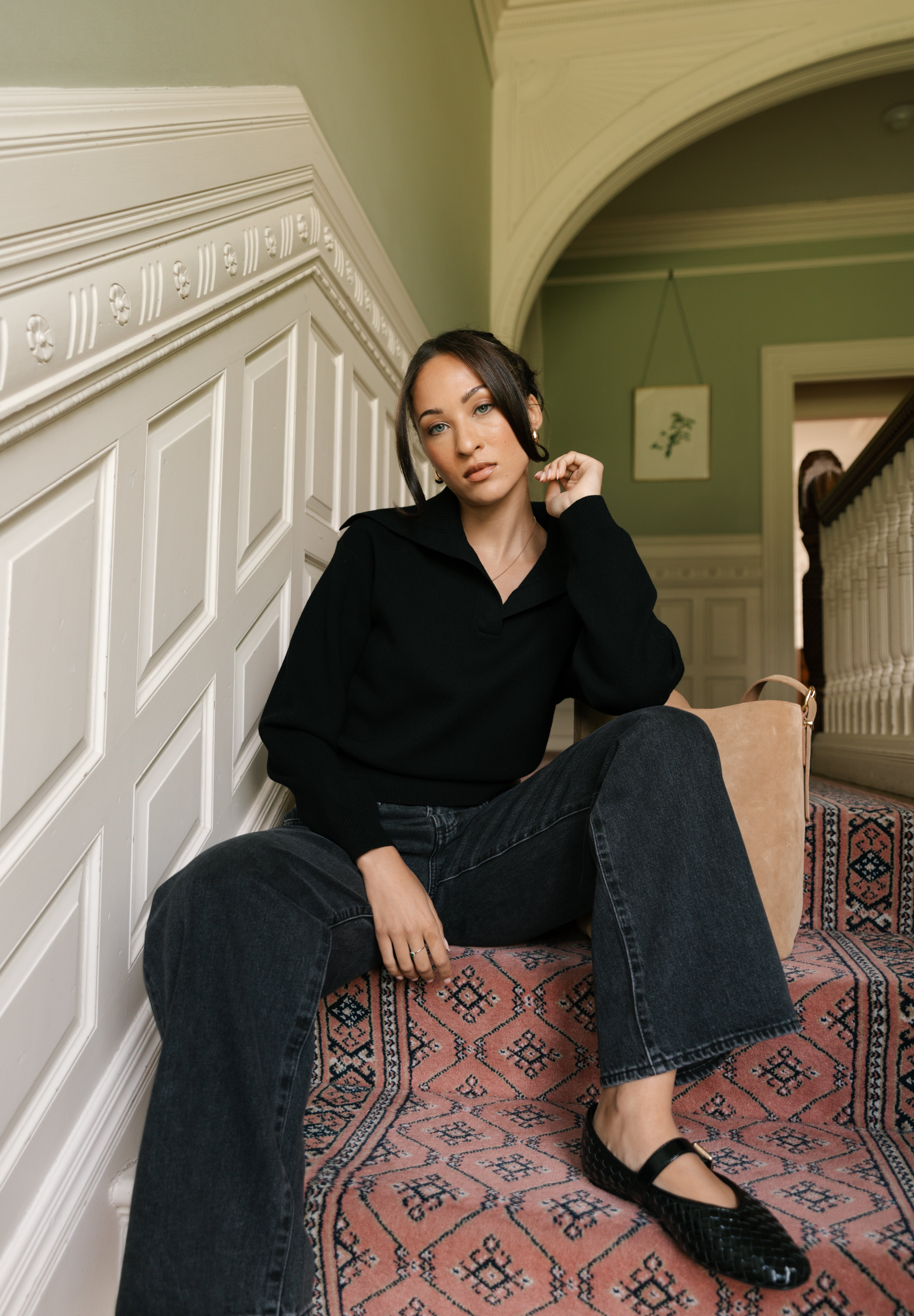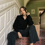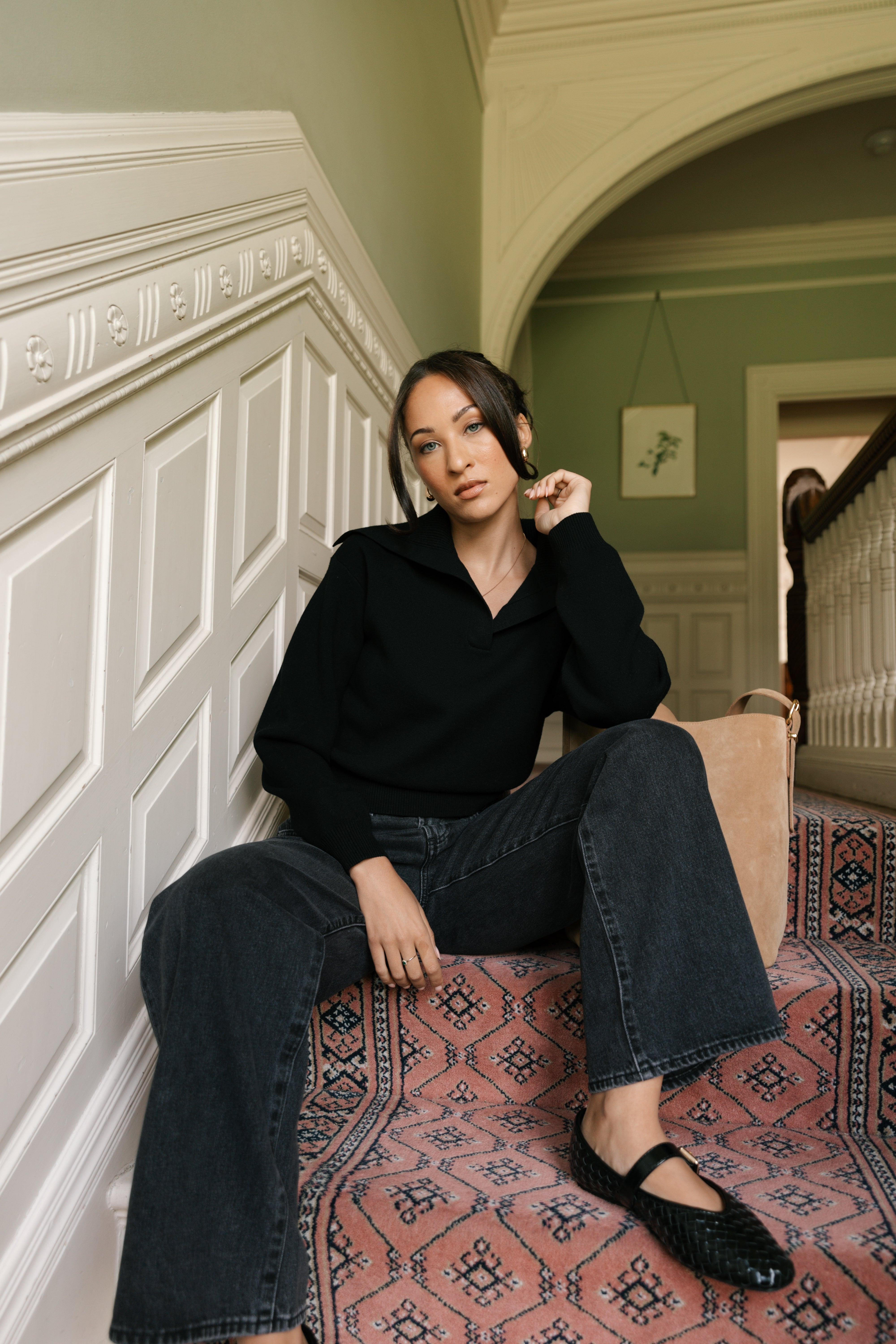 The Kada sweater is a modern, polished knit with a subtle statement collar. Designed in classic black, it features a structured V-neckline with an exaggerated collar detail, giving it a chic, slightly nautical feel. The fit is relaxed yet refined, with tapered cuffs and hem ribbing for a clean finish.