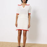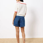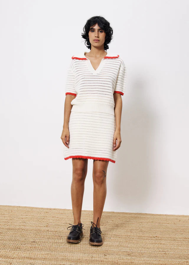 A playful twist on a timeless classic, the Caina Polo Sweater by FRNCH brings vintage charm into modern styling. Crafted from 100% cotton, this breathable knit features an openwork design for a breezy, lightweight feel. The short sleeves and relaxed fit make it a warm-weather staple, while vibrant red contrast details at the collar and cuffs add a bold pop of color. Whether paired with denim or tucked into a midi skirt, it’s the perfect piece to elevate your everyday look.