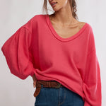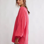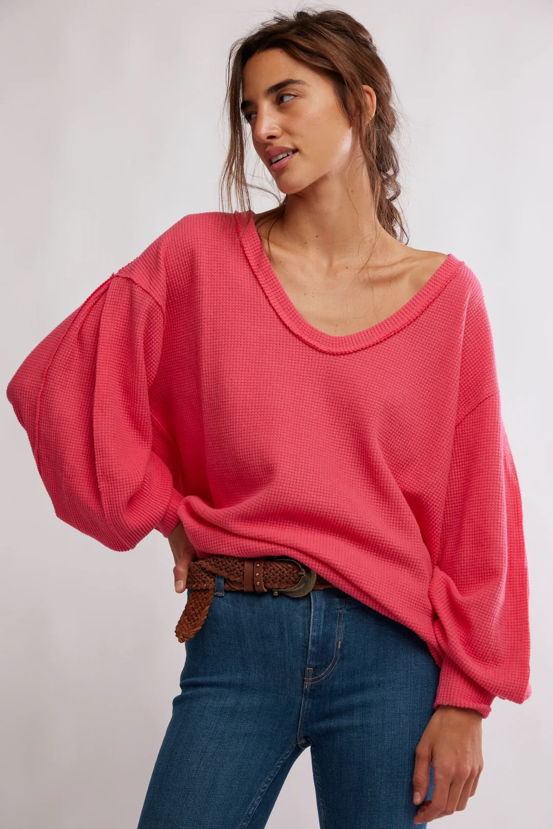The Free People Coast 2 Coast Thermal (from their We The Free line) is a delightfully soft, slightly roughed-up everyday layer. Crafted from a waffle-knit cotton blend, it features an oversized, long-line fit with a V-neckline, slouchy drop shoulders, exposed seams, and cuffed sleeves for casual texture shopv2v.com+10freepeople.com+10lyst.com+10. The lightly distressed finish gives it a laid-back, lived-in look, perfect for pairing over leggings or high-rise jeans. Whether you’re lounging at home or heading out for a coffee run, it brings cozy warmth with relaxed style—an effortless go-to for chillier days.