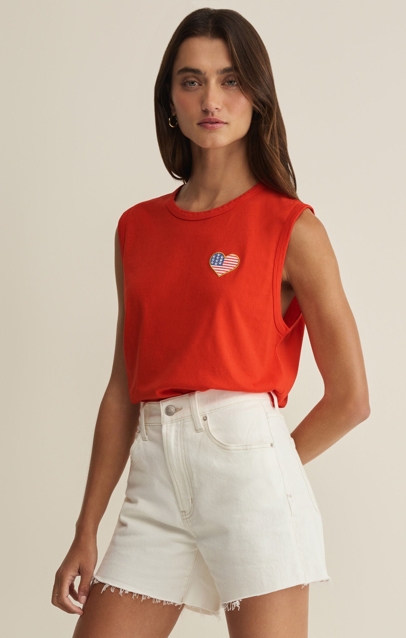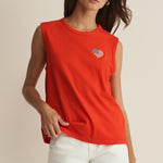 Bold, fun, and ready for summer celebrations, this Z Supply muscle tank features a bright pop of red and a cute embroidered Americana heart. Made from soft, breathable cotton with an easy, relaxed fit, it pairs effortlessly with denim shorts, white jeans, or skirts. Perfect for BBQs, lake days, and all your warm-weather festivities.