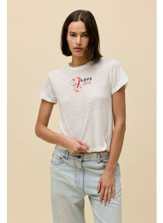This is a vintage-inspired graphic tee with a slightly cropped, fitted silhouette. Made from soft, lightweight cotton in an off-white hue, it features a small chest graphic with a playful heart character and the words “Love Sick” in retro lettering. The rolled sleeves and relaxed neckline give it an easy, worn-in feel—perfect for pairing with high-waisted jeans or cutoffs for an effortlessly cool, nostalgic look