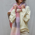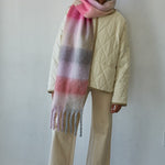 Design: Oversized brushed scarf in a dreamy plaid palette of lavender, blush, cream, and soft neutrals.