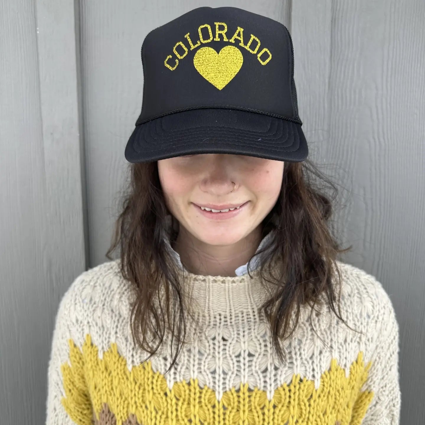 Colorado on Black Trucker with Gold Glitter Font.